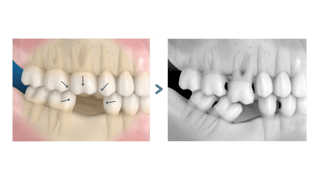- Shifting of neighbouring teeth: Gaps cause nearby teeth to tilt or drift, creating bite misalignment.